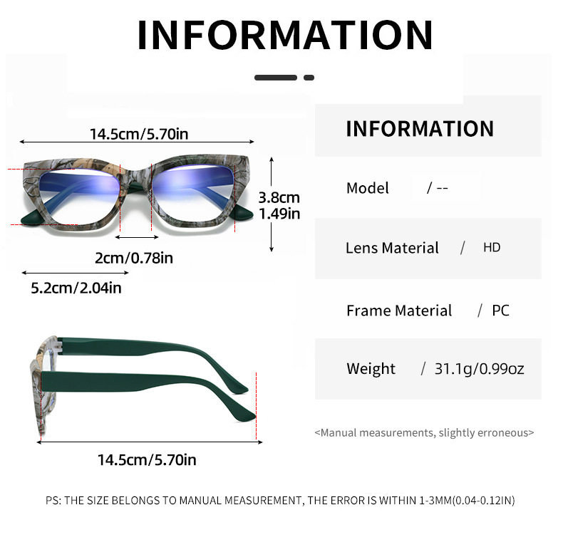 Prescription: 0 diopters (blue-light-blocking decorative glasses), +100, +150, +200, +250, +300, +350, +400
